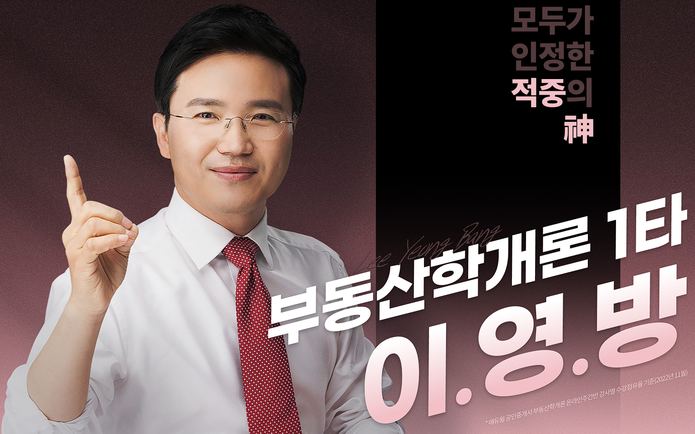 부동산학개론 과목을 에듀윌 공인중개사로 준비하시는 수험생들의 절반 이상은 이영방 교수님으로 준비하여 무난히 합격점수를 받습니다. 교수님 강의의 특징은 기본강의를 완벽히 준비하시고 핵심이론 & 기출문제 강의에 들어가 문제를 풀때 기본강의때 배웠던 이론들이 어떻게 문제화되어 출제되는지 알려주시며 전체 단원 이론 복습을 해줍니다. 또 다른 가장 큰 특징은 계산문제 풀이법입니다. 어떠한 계산문제이든 1분 안에 해결할 수 있도록 본인만의 공식을 알려주십니다. 부동산학개론 문제 중 계산문제 비중은 약 8문제 내외인데 20점을 단 10분 안에 챙겨갈 수 있도록 도와주십니다.