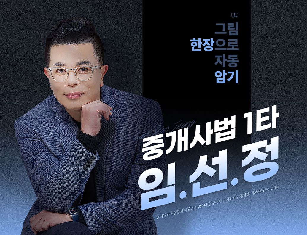 중개사법은 임선정 교수님과 함께라면 충분히 80점을 맞을 수 있다고 생각합니다. 다만 중개사법 과목 자체가 단순 암기를 요하므로 여러 암기코드가 존재합니다. 교수님이 제시하는 암기코드를 시험 전까지만 가지고 놀 수 있다면 시험 막바지에는 중개사법 공부에 큰 시간을 들이지 않더라도 암기코드 만으로도 문제풀이 속도가 확실히 올라갑니다. 반드시 그렇게 되도록 교수님께서 도와주십니다.