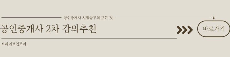 👉 공인중개사 2차 시험은 중개사법, 공법, 공시·세법 총 3과목으로 이루어져 있으나 시험 준비 시에는 중개사법, 공법, 공시법, 세법 총 4과목을 준비하게 됩니다. 시험 합격을 위한 각 과목별 시간투자와 공부법 등 필자의 2차 시험 후기와 추천드리는 강사분들에 관해 궁금하시다면 위를 클릭하셔서 확인하시기 바랍니다.